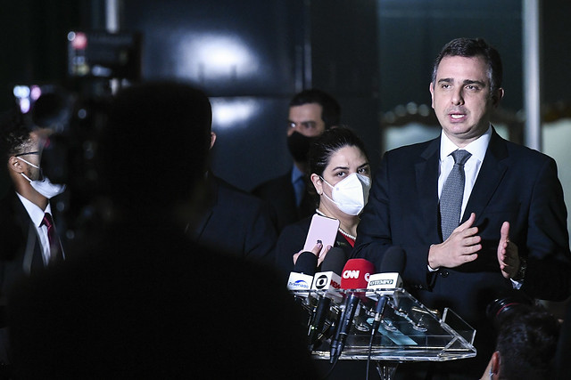 Presidente do Senado Federal, senador Rodrigo Pacheco (PSD-MG), conversa com a imprensa, nesta quarta-feira (17), após reunião com o presidente do Supremo Tribunal Federal (STF). Pacheco reitera a importância do alinhamento entre os Poderes para resolver a questão do orçamento público.