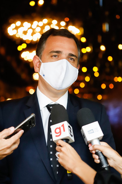 Presidente do Senado Federal, senador Rodrigo Pacheco (PSD-MG), concede entrevista durante evento Conexão Empresarial, realizado em Belo Horizonte (MG).