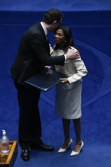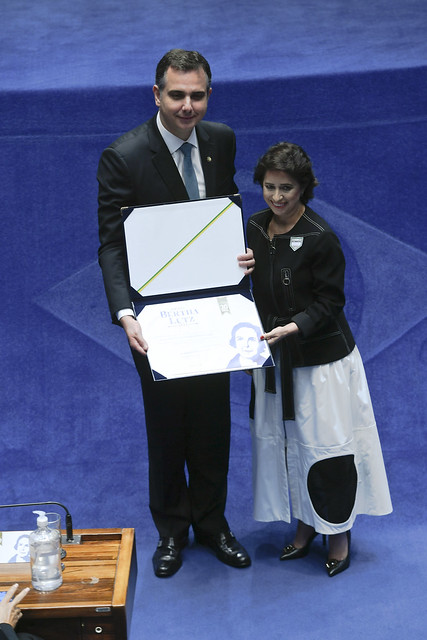 Presidente do Senado Federal, senador Rodrigo Pacheco (PSD-MG) recebe as agraciadas do Diploma Bertha Lutz.
