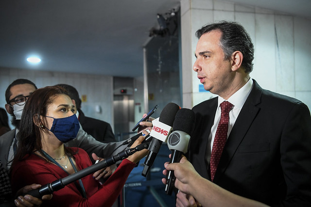 Presidente do Senado, senador Rodrigo Pacheco (PSD-MG), concede entrevista.