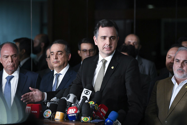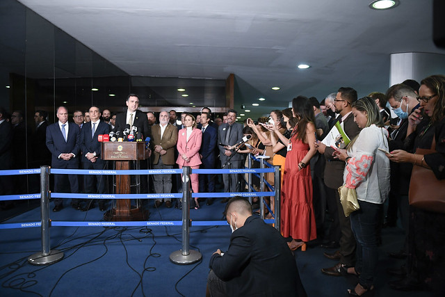 Após reunião com secretários estaduais de fazenda, o presidente do Senado, senador Rodrigo Pacheco (PSD-MG), ao lado do senador Jean Paul Prates (PT-RN), concede coletiva em que fala de reforma tributária e redução do Imposto sobre Circulação de Mercadorias e Prestação de Serviços (ICMS) sobre combustíveis.
