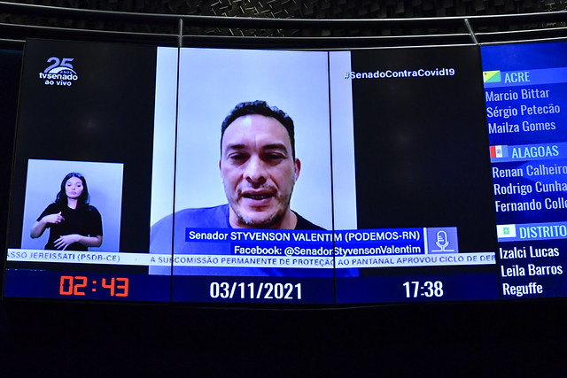 Painel exibe senador Styvenson Valentim (Podemos-RN) em pronunciamento via videoconferência.