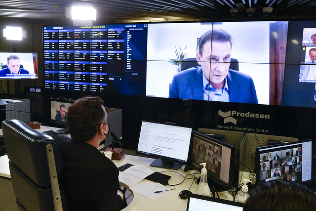 Sessão Deliberativa Remota (SDR) do Senado Federal realizada a partir da sala de controle da Secretaria de Tecnologia da Informação (Prodasen).
