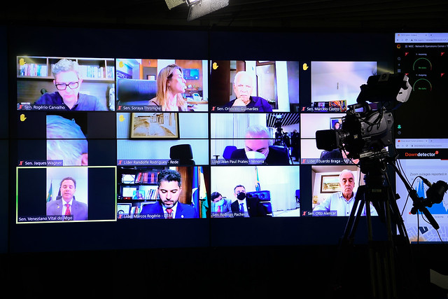 Sessão Deliberativa Remota (SDR) do Senado Federal realizada a partir da sala de controle da Secretaria de Tecnologia da Informação (Prodasen).