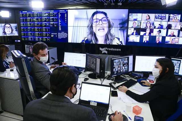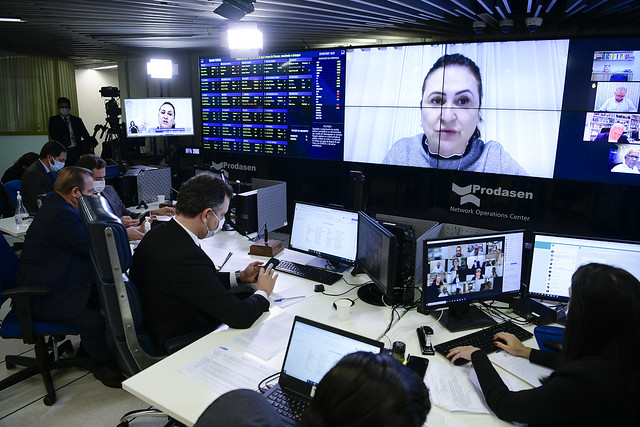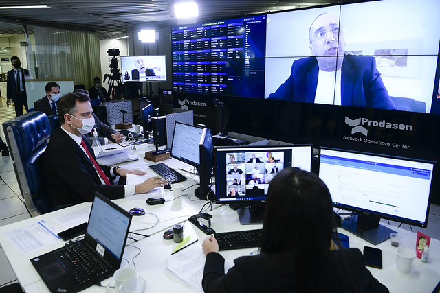 Sessão Deliberativa Remota (SDR) do Senado Federal realizada a partir da sala de controle da Secretaria de Tecnologia da Informação (Prodasen).