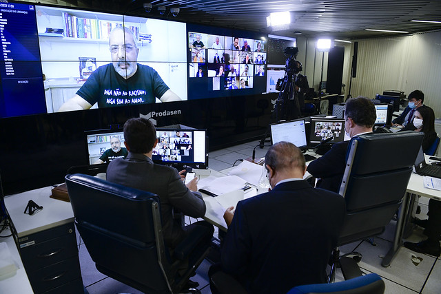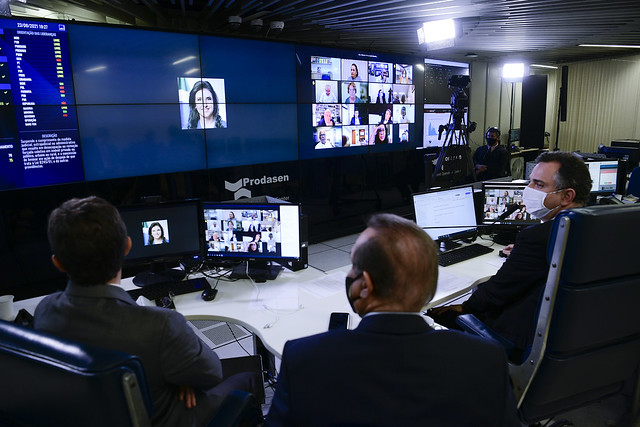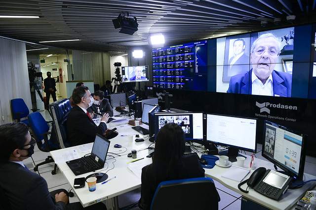 Sessão Deliberativa Remota (SDR) do Senado Federal realizada a partir da sala de controle da Secretaria de Tecnologia da Informação (Prodasen).
