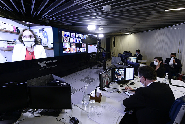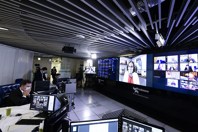 Sessão Deliberativa Remota (SDR) do Senado Federal realizada a partir da sala de controle da Secretaria de Tecnologia da Informação (Prodasen).