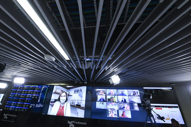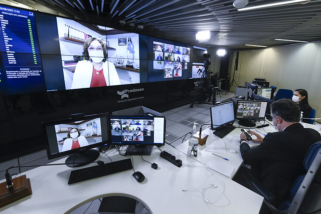 Sessão Deliberativa Remota (SDR) do Senado Federal realizada a partir da sala de controle da Secretaria de Tecnologia da Informação (Prodasen).